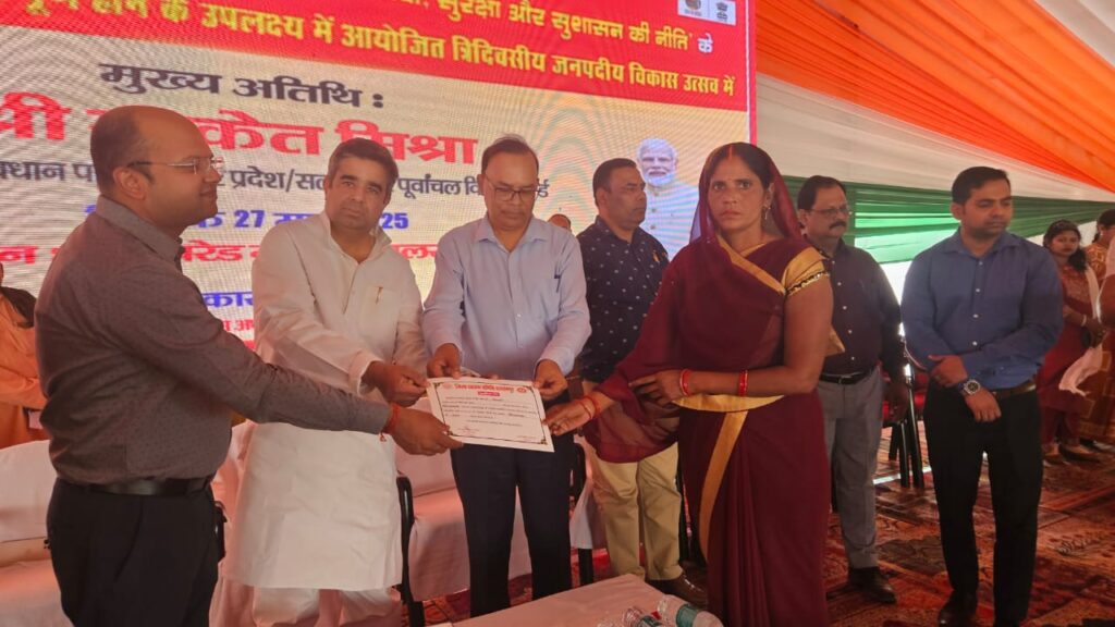 गुरूवार को बड़ा परेड ग्राउंड में आयोजित विकास महोत्सव के मंच जनपद स्तरीय आशा सम्मेलन को सम्बोधित करते हुए मुख्य अतिथि सदस्य विधान परिषद व पूर्वांचल विकास बोर्ड के सलाहकार साकेत मिश्रा ने कहा कि शासन की योजना व राष्ट्रीय कार्यक्रमों को जन-जन तक पहुंचाकर लाभान्वित कराने का उत्कृष्ट कार्य करने वाली आशाओं को सम्मानित करने से उनका मनोबल बढ़ता है। इस पावन अवसर पर जब हम सभी इस आशा सम्मेलन में एकत्रित हुए है, मेरा हृदय गर्व और सम्मान से भर उठा है। उन्होने कहा कि आप सभी आशा बहनें और स्वास्थ्य कार्यकर्ता हमारे समाज की सच्ची नायिकाएं है। जिस समर्पण, सेवा भावना और कर्तव्यनिष्ठा के साथ आप अपने कर्तव्यों का निर्वहन करती है, वह अनुकरणीय है। उन्होने कहा कि वे न केवल स्वास्थ्य सेवा का एक मजबूत स्तम्भ है बल्कि अपने क्षेत्र की रीढ़ भी है। मुख्य चिकित्सा अधिकारी डा. मुकेश कुमार रस्तोगी ने बताया कि इस तीन दिवसीय विकास महोत्सव में स्वास्थ्य विभाग द्वारा आयोजित जन आरोग्य मेले में 1430 मरीजों का उपचार किया गया, 323 मरीजों के रक्तचाप की जांच , 289 मरीजों का शुगर की जांच , 36 मरीजों के बलगम की जांच किया गया तथा 143 दिव्यागजनों का दिव्यांग प्रमाण पत्र जारी किए गए। कार्यक्रम का शुभारंभ दीप प्रज्ज्वलित कर किया गया। कार्यक्रम में उत्कृष्ट कार्य करने वाली आशाओं को प्रमाण पत्र वितरित कर उन्हें सम्मानित किया गया। इस अवसर पर प्रधानमंत्री टीबी मुक्त भारत अभियान के अंतर्गत टीबी मुक्त 46 ग्राम पंचायतों के ग्राम प्रधानों को स्मृति चिन्ह देकर सम्मानित किया गया।